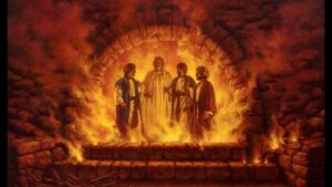 King Nebuchadnezzar of Babylon erected a golden statue and commanded all his subjects to bow down and worship it. Three young men—Shadrach, Meshach, and Abednego—refused to comply, remaining faithful to their God despite the threat of death. Their defiance enraged Nebuchadnezzar, who ordered them to be thrown into a blazing furnace heated seven times hotter than usual. The king’s soldiers carried out the command, but the flames were so intense that they killed those who approached the furnace.